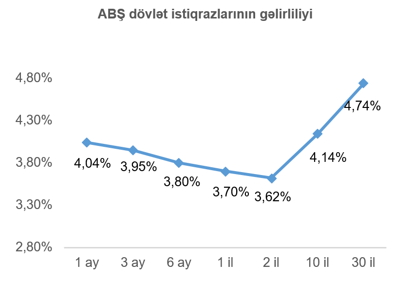 Geridə qoyduğumuz həftə ərzində ABŞ dövlət istiqrazlarının gəlirlilikləri bütün tədavül müddətləri üzrə artmışdır. Vacib istinad göstəricisi (bençmark) kimi istifadə olunan 10 il tədavül müddətli ABŞ dövlət istiqrazının gəlirliliyi həftənin sonuna bir həftə əvvələ nisbətdə 0,03 faiz bəndi artaraq 4,14% təşkil etmişdir.