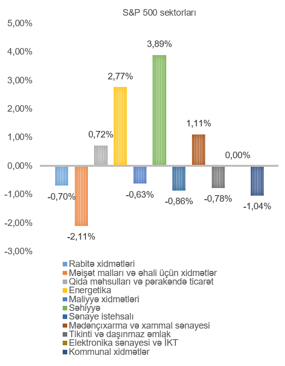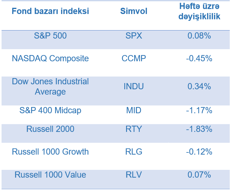 ABŞ-ın ən böyük fond bazarı indeksi olan “S&P 500” həftə ərzində 0,08% artmışdır. Ən çox artan səhiyyə (3,89%), energetika (2,77%) və mədənçıxarma və xammal sənayesi (1,11%) sektorlarını təmsil edən şirkətlərin səhmlərində olmuşdur. Ən çox dəyər itkisi isə məişət malları və əhali üçün xidmətlər (2,11%) və kommunal xidmətlər (1,04%) sektorlarını təmsil edən şirkətlərin səhmlərində olmuşdur.