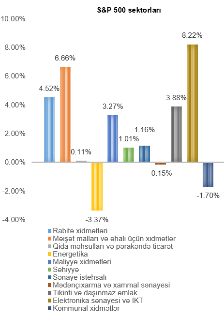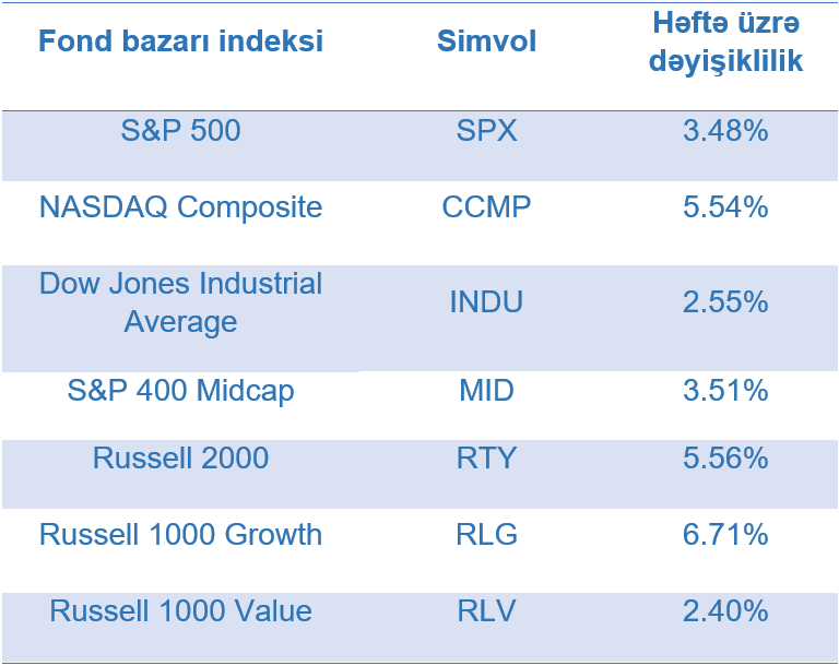 ABŞ-ın ən böyük fond bazarı indeksi olan “S&P 500” həftə ərzində 3,48% artmışdır. Elektronika sənayesi və İKT (8,22%) sektoru başda olmaqla, əksər sektorlarda artım müşahidə olunmuş, dəyər itkisi əsasən energetika (3,37%) və kommunal xidmətlər (1,70%) şirkətlərinin səhmlərində müşahidə edilmişdir.