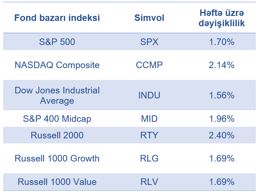 Buna baxmayaraq, ümumilikdə, ötən həftə ərzində ABŞ-ın əsas fond bazarı indeksləri artmışdır. Böyük fond bazarı indeksləri içində ən çox artım “NASDAQ Composite” fond bazarı indeksinin göstəricisində müşahidə edilmişdir (2,14%). Bu artım, ötən həftə süni intellekt (AI) sahəsində nikbinliyin artmasından qaynaqlanmışdır. Həmçinin, kiçik bazar kapitalizasiyalı şirkətləri təmsil edən “Russell 2000” (2,40%) fond bazarı indeksinin artımı da diqqət çəkmişdir. Buna səbəb ABŞ mərkəzi bankının pul-kredit siyasətini yumşaltma trayektoriyası barədə gözləntilər olmuşdur.
