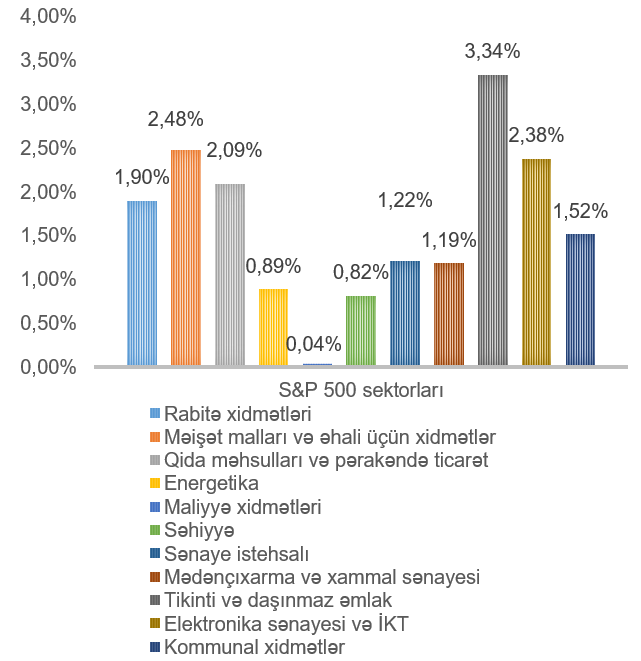 ABŞ-ın ən böyük fond bazarı indeksi olan “S&P 500” həftə ərzində 1,70% artmışdır. Qeyd edək ki, artım indeksi təşkil edən bütün sektorları əhatə etmişdir. Ən çox artan tikinti və daşınmaz əmlak (3,34%), məişət malları və əhali üçün xidmətlər (2,48%), elektronika sənayesi və İKT (2,38%) sektorlarını təmsil edən şirkətlərin səhmlərində olmuşdur.