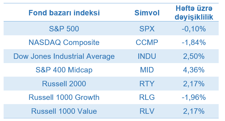 Ötən həftə ərzində ABŞ-ın aparıcı fond bazarı indekslərinin göstəriciləri qarışıq olmuşdur. İKT sahəsi ağırlıqlı “NASDAQ Composite” indeksi 1,84% azalmış, “Dow Jones Industrial Average” indeksi 2,50% artmışdır. Qeyd edək ki, orta və kiçik bazar kapitalizasiyalı şirkətlərin səhmləri daha yaxşı dinamika sərgiləmişdir. Belə ki, ötən həftə ərzində orta bazar kapitalizasiyalı şirkətlərin səhmlərinin dəyərini izləyən “S&P 400 Midcap” indeksi 4,36%, kiçik bazar kapitalizasiyalı şirkətlərin səhmlərinin dinamikasını izləyən “Russell 2000” indeksi isə 2,17% yüksəlmişdir. Həmçinin, artım şirkətlərinin səhmlərini təmsil edən “Russell 1000 Growth” indeksi 1,96% azaldığı halda dəyər şirkətlərinin səhmlərini təmsil edən Russell 1000 Value” indeksi 2,17% artmışdır.