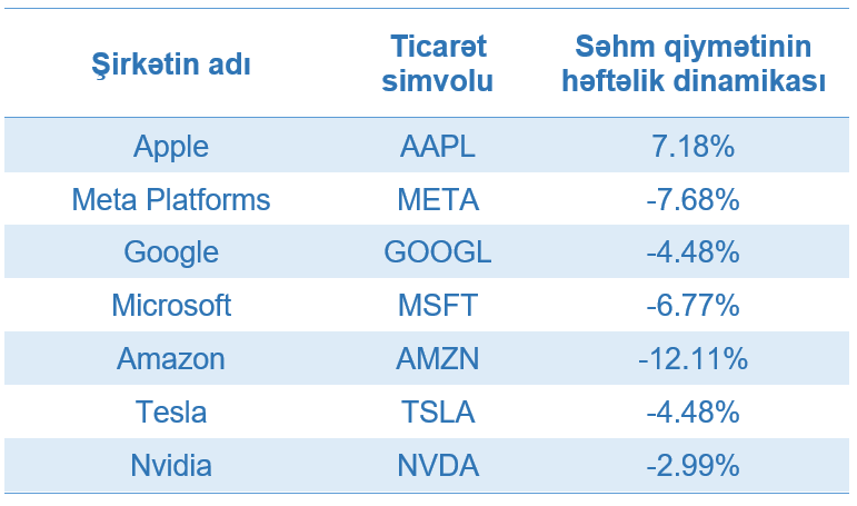 “Apple” şirkəti xaric (ticarət simvolu: AAPL) “Möhtəşəm yeddiliyi” təşkil edən şirkətlərin səhmlərinin dəyərində kəskin azalma müşahidə edilmişdir. “Amazon” şirkətinin (ticarət simvolu: AMZN) dəyərinin həftə ərzində 12,11% enməsi xüsusilə diqqət cəlb etmişdir. Şirkətin 2026-ci ildə süni intellekt sahəsinə 200 milyard ABŞ dolları ayırdığını açıqlaması sözügedən sahəyə qarşı skeptisizmin artdığı həftədə şirkətin səhm dəyərinə təzyiq göstərən başlıca səbəb olmuşdur.