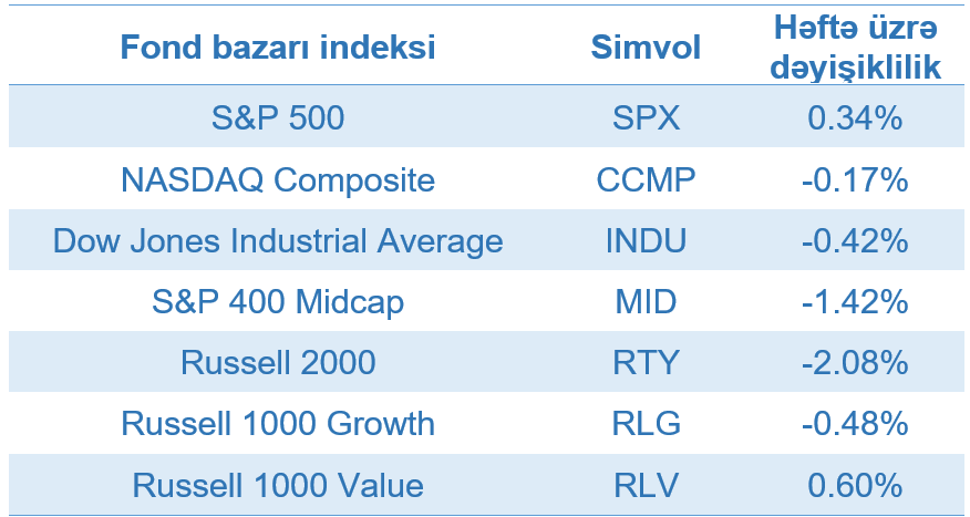 Ötən həftənin ərzində ABŞ-ın aparıcı fond bazarı indekslərinin əksəriyyəti mənfi dinamika nümayiş etdirmişdir. İKT sahəsi ağırlıqlı “NASDAQ Composite” indeksi 0,17%, “Dow Jones Industrial Average” indeksi isə 0,42% geriləmişdir. Qeyd etmək lazımdır ki, orta və kiçik bazar kapitalizasiyalı şirkətlərin səhmləri daha çox dəyər itirtmişdir. Belə ki, orta bazar kapitalizasiyalı şirkətlərin səhmlərinin dinamikasını izləyən “S&P 400 Midcap” indeksi 1,42%, kiçik bazar kapitalizasiyalı şirkətlərin səhmlərinin dinamikasını izləyən “Russell 2000” indeksi isə 2,08% azalma nümayiş etdirmişdir. Əlavə olaraq, vurğulamaq lazımdır ki, dəyər səhmləri dəyər qazanmış, artım səhmləri isə dəyər itirmişdir.