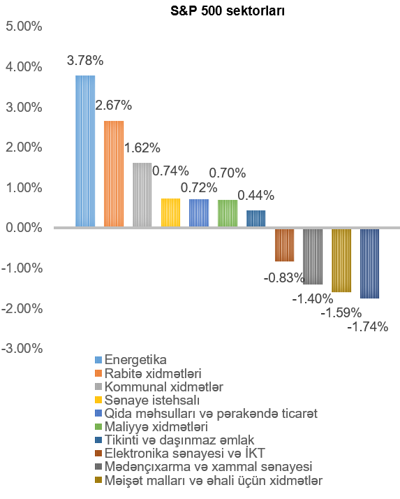 Ən çox artım energetika (3,78%) və rabitə xidmətləri (2,67%) sektorlarını təmsil edən şirkətlərin səhmlərində olmuşdur. Ən çox dəyər itkisi isə səhiyyə (1,74%) sektorunu təmsil edən şirkətlərin səhmlərində müşahidə edilmişdir.