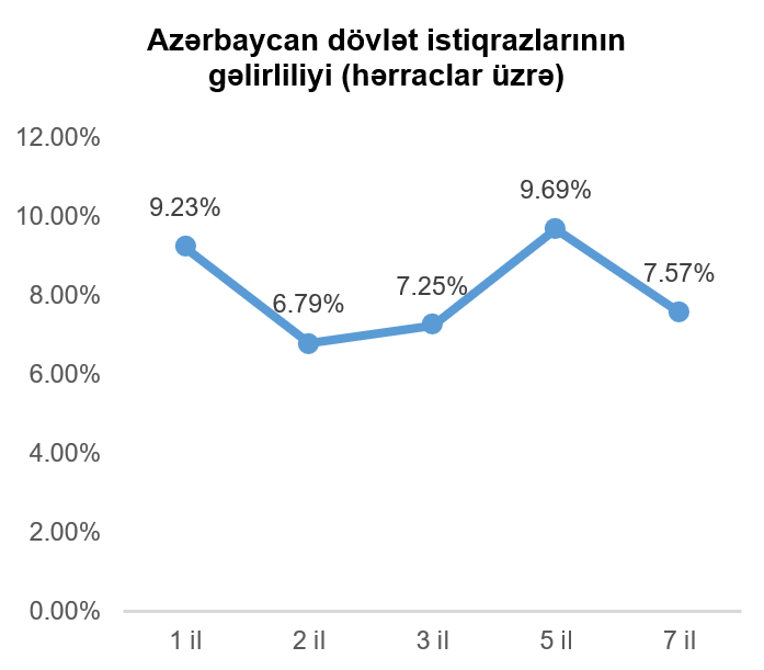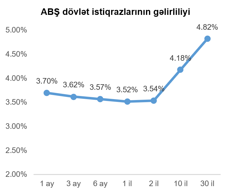 Geridə qoyduğumuz həftə ərzində qısa və uzunmüddətli ABŞ dövlət istiqrazlarının gəlirliliklərində azalma, ortamüddətli dövlət istiqrazlarının gəlirliliklərində isə artım müşahidə olunmuşdur. Vacib istinad göstəricisi (bençmark) kimi istifadə olunan 10 il tədavül müddətli ABŞ dövlət istiqrazının gəlirliliyi həftənin sonuna bir həftə əvvələ nisbətdə 0,01 faiz bəndi azalaraq 4,18% təşkil etmişdir.