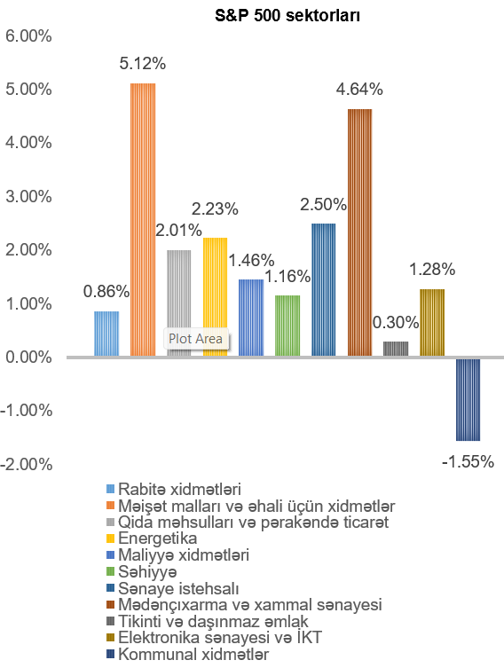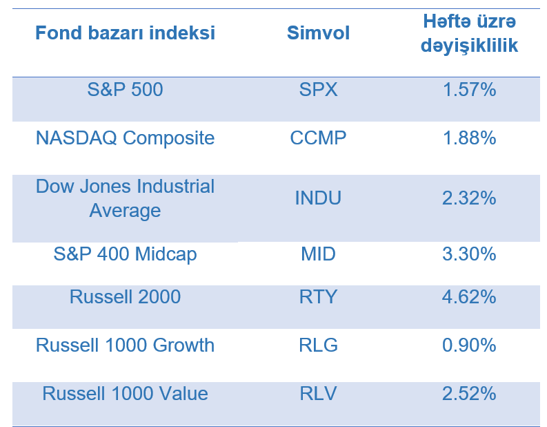 ABŞ-ın ən böyük fond bazarı indeksi olan “S&P 500” həftə ərzində 1,57% artmışdır. Demək olar ki, bütün sektorlar üzrə artım müşahidə olunmuş, ən çox artım məişət malları və əhali üçün xidmətlər (5,12%) və mədənçıxarma və xammal sənayesi (4,64%) sektorlarını təmsil edən şirkətlərin səhmlərində olmuşdur. Dəyər itkisi isə yalnız kommunal xidmətlər (1,55%) sektorunu təmsil edən şirkətlərin səhmlərində olmuşdur.