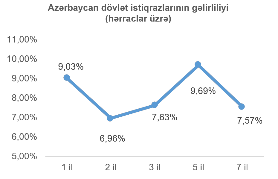 7 oktyabr 2025-ci il tarixində Bakı Fond Birjasında tədavül müddəti 3 il olan dövlət ortamüddətli istiqrazlarının yerləşdirilməsi üzrə hərrac keçirilmişdir. Hərracda 14 investor iştirak etmiş və tələb təklifdən 349% çox olmuşdur. Maliyyə Nazirliyinin qərarına əsasən kəsmə gəlirlilik 7,7799% olaraq müəyyən edilmiş, alış sifarişlərinin böyük hissəsi (78%) daha yuxarı gəlirliliklə təqdim edildiyindən hərrac nəticəsində təmin edilməmişdir. Ümumilikdə, təmin edilmiş sifarişlər üzrə ortaölçülmüş gəlirlilik 7,6259% təşkil etmişdir ki, bu da əvvəlki analoji hərracın nəticəsi ilə müqayisədə 0,1241 faiz bəndi az olmuşdur. Qeyd edək ki, 14 oktyabr 2025-ci il tarixində Bakı Fond Birjasında tədavül müddəti 2 il olan dövlət ortamüddətli istiqrazlarının yerləşdirilməsi üzrə hərrac keçiriləcəkdir. Hərraca çıxarılacaq istiqrazların həcmi 20 milyon manat təşkil edəcəkdir.