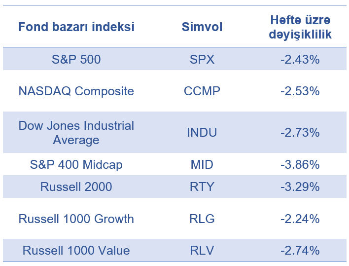 Son həftə ərzində ABŞ-ın əsas fond bazarı indeksləri geriləmişdir. Kiçik və orta bazar kapitalizasiyalı şirkətləri təmsil edən “Russell 2000” və “ S&P 400 Midcap fond bazarı indekslərində eniş daha kəskin olmuşdur.