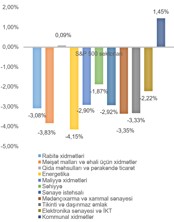 ABŞ-ın ən böyük fond bazarı indeksi olan “S&P 500” həftə ərzində 2,43% azalmışdır. Qeyd edək ki, ən çox dəyər itkisi energetika (4,15%) və məişət malları və əhali üçün xidmətlər (3,83%) sektorlarını təmsil edən şirkətlərin səhmlərində müşahidə edilmişdir. Artan isə kommunal (1,45%) sektorunu təmsil edən şirkətlərin səhmləri olmuşdur.
