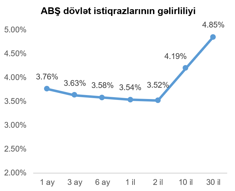 Geridə qoyduğumuz həftə ərzində qısamüddətli ABŞ dövlət istiqrazlarının gəlirlilikləri azalmış, 10 və 30 il tədavül müddəti olan dövlət istiqrazlarının gəlirliliklərində isə artım müşahidə olunmuşdur. Vacib istinad göstəricisi (bençmark) kimi istifadə olunan 10 il tədavül müddətli ABŞ dövlət istiqrazının gəlirliliyi həftənin sonuna bir həftə əvvələ nisbətdə 0,05 faiz bəndi artaraq 4,19% təşkil etmişdir.