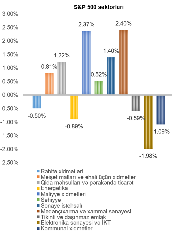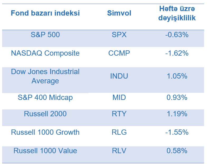 ABŞ-ın ən böyük fond bazarı indeksi olan “S&P 500” həftə ərzində 0,63% azalmışdır. Ən çox artan mədənçıxarma və xammal sənayesi (2,40%), maliyyə xidmətləri (2,37%), sənaye istehsalı (1,40%) və qida məhsulları və pərakəndə ticarət (1,22%) sektorlarını təmsil edən şirkətlərin səhmlərində olmuşdur. Ən çox dəyər itkisi isə elektronika sənayesi və İKT (1,98%) və kommunal xidmətlər (1,09%) sektorlarını təmsil edən şirkətlərin səhmlərində olmuşdur.