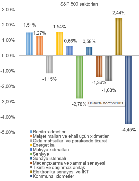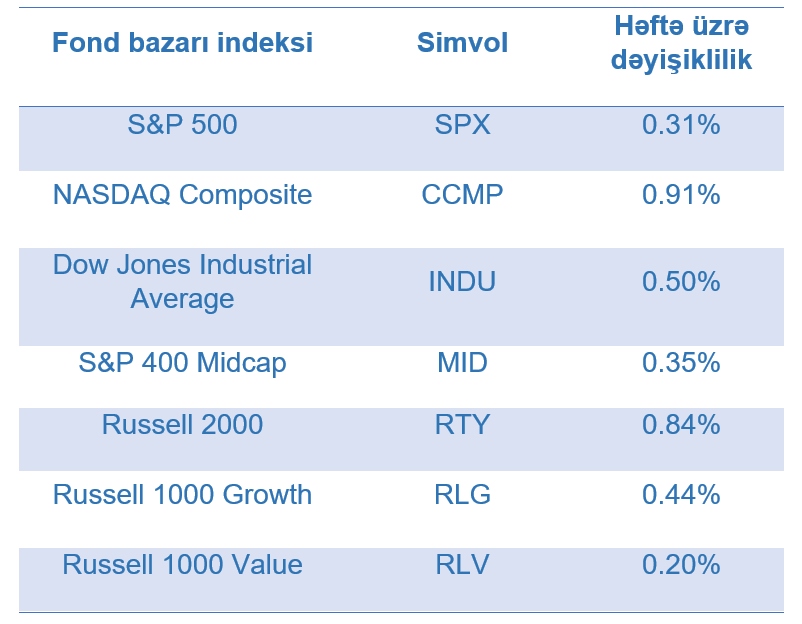 ABŞ-ın ən böyük fond bazarı indeksi olan “S&P 500” həftə ərzində 0,31% artmışdır. Ən çox artan elektronika sənayesi və İKT (2,44%), energetika (1,54%), rabitə xidmətləri (1,51%) və məişət malları və əhali üçün xidmətlər (1,27%) sektorlarını təmsil edən şirkətlərin səhmlərində olmuşdur. Ən çox dəyər itkisi isə kommunal xidmətlər (4,45%) və səhiyyə (2,78%) sektorlarını təmsil edən şirkətlərin səhmlərində olunmuşdur.