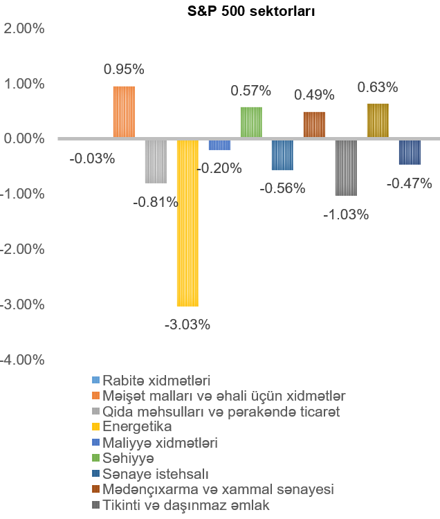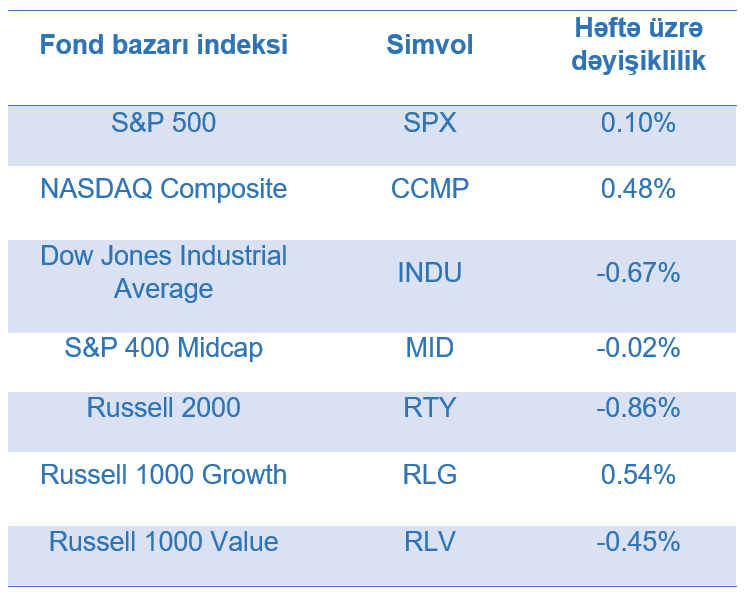ABŞ-ın ən böyük fond bazarı indeksi olan “S&P 500” həftə ərzində 0,10% artmışdır. Ən çox artan məişət malları və əhali üçün xidmətlər (0,95%) sektorunu təmsil edən şirkətlərin səhmlərində olmuşdur. Ən çox dəyər itkisi isə energetika (3,03%), tikinti və daşınmaz əmlak (1,03%) və qida məhsulları və pərakəndə ticarət (0,81%) sektorlarını təmsil edən şirkətlərin səhmlərində olmuşdur.