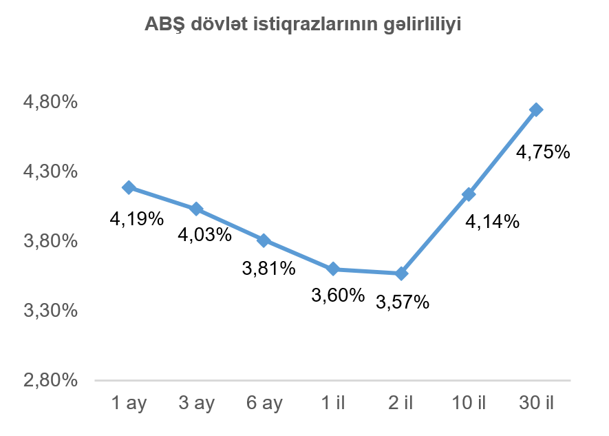 Ümumilikdə, son həftə həm ABŞ mərkəzi bankının uçot faiz dərəcələrini azaltması, həm də yuxarıda qeyd olunan makroiqtisadi göstəricilərin müsbət olması fonunda qısamüddətli ABŞ dövlət istiqrazların gəlirlilikləri azalmış, uzunmüddətli ABŞ dövlət istiqrazlarının gəlirlilikləri isə artmışdılar. Vacib istinad göstəricisi (bençmark) kimi istifadə olunan 10 il tədavül müddətli ABŞ dövlət istiqrazının gəlirliliyi həftənin sonuna 0,08 faiz bəndi artaraq 4,14% təşkil etmişdir.