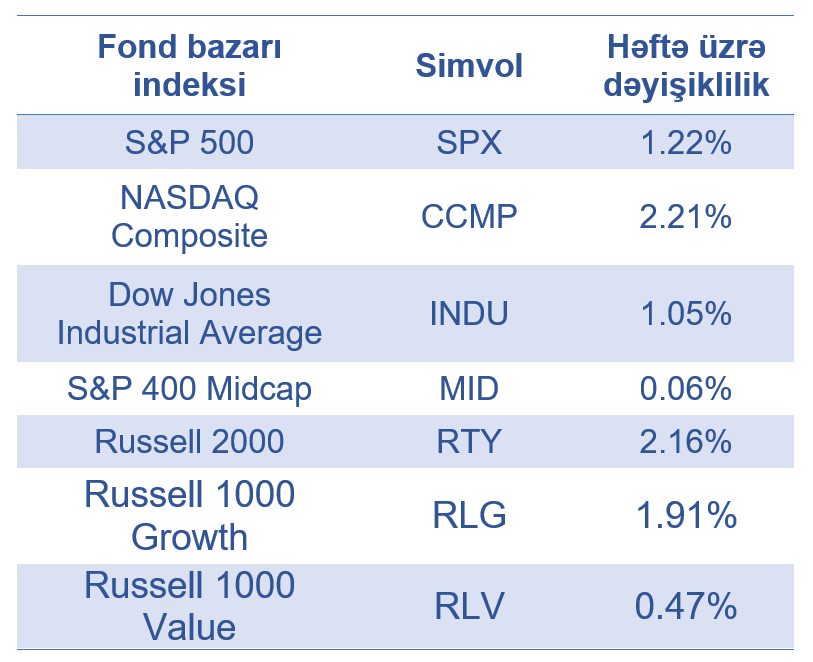 ABŞ-ın ən böyük fond bazarı indeksi olan “S&P 500” həftə ərzində 1,22% artmışdır.