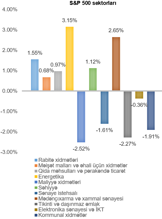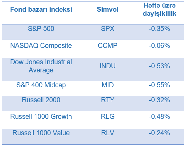 “S&P 500” fond bazarı indeksi həftə ərzində 0,35% azalmışdır. Ən çox artım energetika (3,15%) və mədənçıxarma və xammal sənayesi (2,65%) və sənaye istehsalı (3,07%) sektorlarını təmsil edən şirkətlərin səhmlərində olmuşdur. Ən çox dəyər itkisi isə maliyyə xidmətləri (2,52%), tikinti və daşınmaz əmlak (2,27%) və kommunal xidmətlər (1,91%) sektorlarını təmsil edən şirkətlərin səhmlərində olmuşdur.