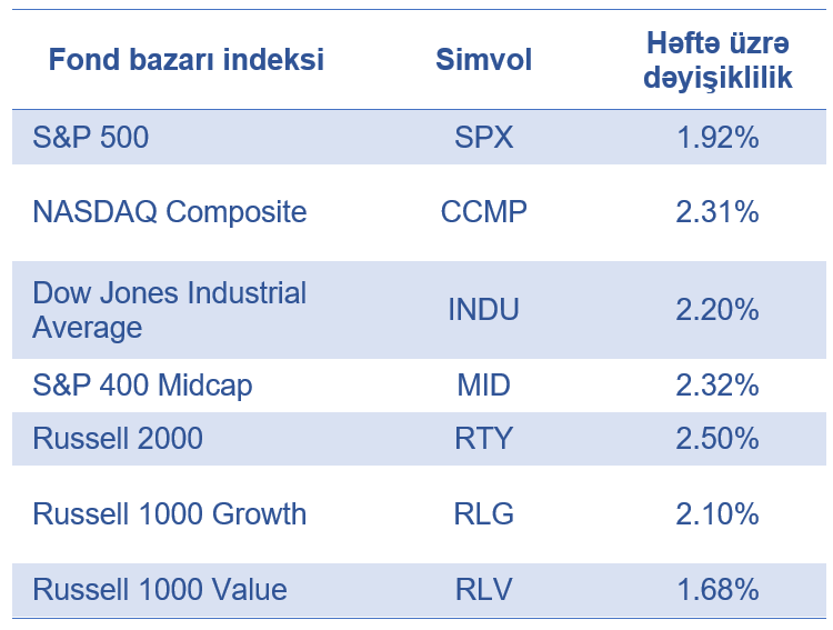 ABŞ-Çin ticarət münasibətlərindəki qarışıq xəbərlərə və ABŞ-ın Rusiyanın iki ən böyük neft şirkətinə sanksiya tətbiq etməsilə dünya bazarında neftin qiymətinin artmasına baxmayaraq ABŞ fond bazarı ötən həftəni yüksəlişlə başa vurmuşdur. Kiçik bazar kapitalizasiyalı şirkətlərin səhmlərinin dəyərini təqib edən “Russell 2000” və orta bazar kapitalizasiyalı şirkətlərin səhmlərinin dəyərini təqib edən “S&P 400 Midcap” fond bazarı indeksləri digər fond bazarı indekslərilə müqayisədə daha çox dəyər qazanmışdır.