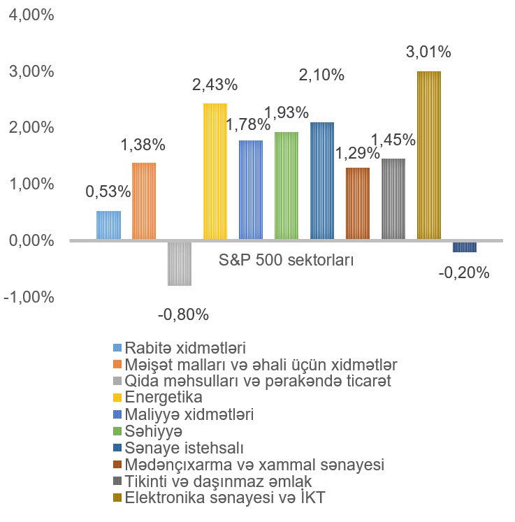 ABŞ-ın ən böyük fond bazarı indeksi olan “S&P 500” həftə ərzində 1,92% artmışdır. Ən çox artan elektronika sənayesi və İKT (3,01%), energetika (2,43%), sənaye istehsalı (2,10%), sektorlarını təmsil edən şirkətlərin səhmlərində olmuşdur. Dəyər itkisi isə qida məhsulları və pərakəndə ticarət (0,80%), kommunal xidmətlər (0,20%) sektorlarını təmsil edən şirkətlərin səhmlərində olmuşdur.