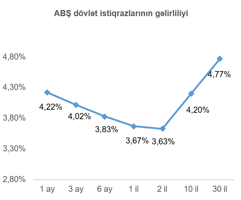 Ümumilikdə, son həftənin makroiqtisadi göstəricilərinə əsasən ABŞ-da iqtisadiyyatının cari artım tempinin gözləniləndən yüksək olması, əmək bazarının bərpa işarələri verməsi, ABŞ iqtisadiyyatında inflyasiya təzyiqlərinin hələ də aktual qalması, habelə, ABŞ mərkəzi bankının pul-kredit siyasətinin yumşaldılmasına dair ehtiyatlı çıxışları ABŞ dövlət istiqrazlarının gəlirliliklərinin artmasına səbəb olmuşdur. Vacib istinad göstəricisi (bençmark) kimi istifadə olunan 10 il tədavül müddətli ABŞ dövlət istiqrazının gəlirliliyi həftənin sonuna 0,06 faiz bəndi artaraq 4,20% təşkil etmişdir.