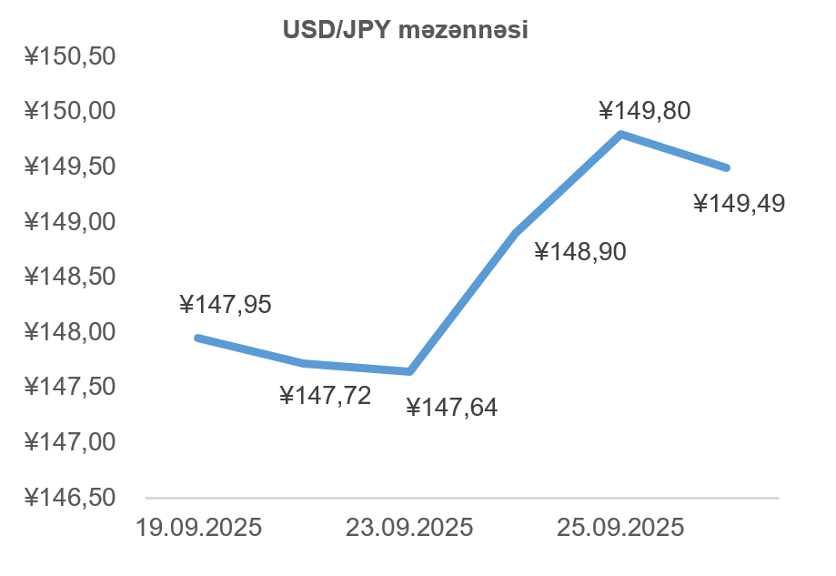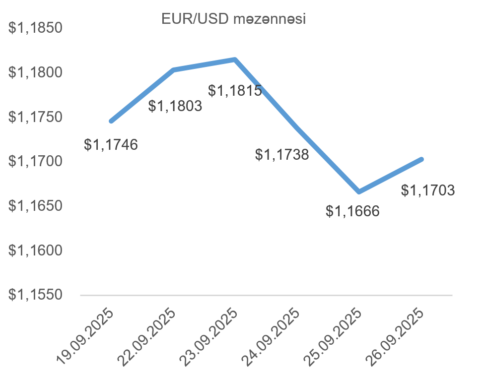 23 sentyabr 2025-ci il tarixində Avrozonanın iqtisadi aktivlik dinamikasını əks etdirən “HCOB Eurozone Composite” PMI göstəricisi avqust ayı üzrə gözləntiləri üstələyərək avronun dollara qarşı dəyər qazanmasına səbəb olmuşdur və cütlüyün məzənnəsi 1 avro üçün 1,1815 ABŞ dolları səviyyəsinə yüksəlmişdir. Lakin, ABŞ mərkəzi bankının idarə heyətinin sədri Cerom Pauel və bankın digər rəsmilərinin iqtisadi perspektivlərlə bağlı açıqlamaları faiz endirimlərinin tezliyi barədə qeyri-müəyyənliyi artırmışdır. Habelə, ABŞ-da işsizlik müavinətinə ilkin müraciətlər ikinci həftə ardıcıl olaraq yaxşılaşaraq 218 minə enmişdir. Eyni zamanda, rüblük ÜDM artımı proqnozları üstələyərək 3.8% səviyyəsində qeydə alınmışdır. Bu göstəricilər yaxın gələcəkdə faiz endirimlərinin məhdud miqyasda olacağına işarə edərək avronun ABŞ dollarına olan məzənnəsinin həftəlik minimum səviyyəsinə (1 avro üçün 1,1666 ABŞ dolları) düşməsinə səbəb olmuşdur. Lakin, həftənin cümə günü açıqlanan baza şəxsi istehlak xərcləri (core PCE) qiymət indeksi proqnozlara uyğun gəlməsi ABŞ dollarının yenidən dəyər qazanaraq 1 avro üçün 1,1703 ABŞ dolları səviyyəsinə çatmasını təmin etmişdir. Ümumilikdə, ABŞ mərkəzi bankının yaxın gələcəyə dair pul-kredit siyasətindəki qeyri-müəyyən trayektoriya dolların bir həftə əvvəl ilə müqayisədə möhkəmlənməsinə səbəb olmuşdur.