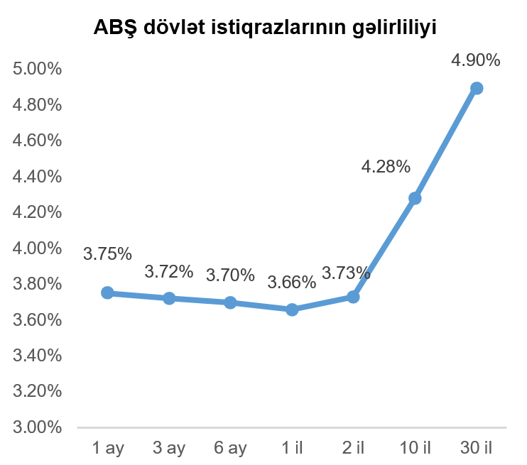 Geridə qoyduğumuz həftə ərzində ABŞ dövlət istiqrazlarının gəlirlilik əyrisinin demək olar ki, bütün nöqtələri üzrə gəlirlilikdə artım müşahidə olunmuşdur. Vacib istinad göstəricisi (bençmark) kimi istifadə olunan 10 il tədavül müddətli ABŞ dövlət istiqrazının gəlirliliyi həftənin sonuna bir həftə əvvələ nisbətdə 0,13 faiz bəndi artaraq 4,28% təşkil etmişdir.