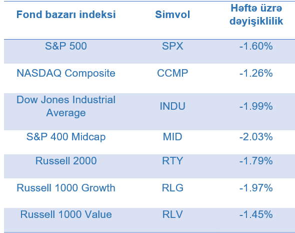 Ötən həftə geosiyasi gərginliklər və yüksək neft qiymətlərinin yaradacağı inflyasiya ilə bağlı narahatlıqlar, fond bazarı indekslərinin səviyyəsini həftə ərzində aşağı salmışdır.