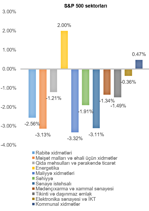 ABŞ-ın ən böyük fond bazarı indeksi olan “S&P 500” həftə ərzində 1,60% azalmışdır ki, bu da artıq indeksin 3-cü ardıcıl həftədir ki, azaldığını bildirir. Dəyər artımı energetika (2,00%) və kommunal xidmətlər (0,47%) sektorlarını təmsil edən şirkətlərin səhmlərində olmuşdur. Ən çox dəyər itkisi isə maliyyə xidmətləri (3,32%), məişət malları və əhali üçün xidmətlər (3,13%) və sənaye istehsalı (3,11%) sektorunlarını təmsil edən şirkətlərin səhmlərində olmuşdur.